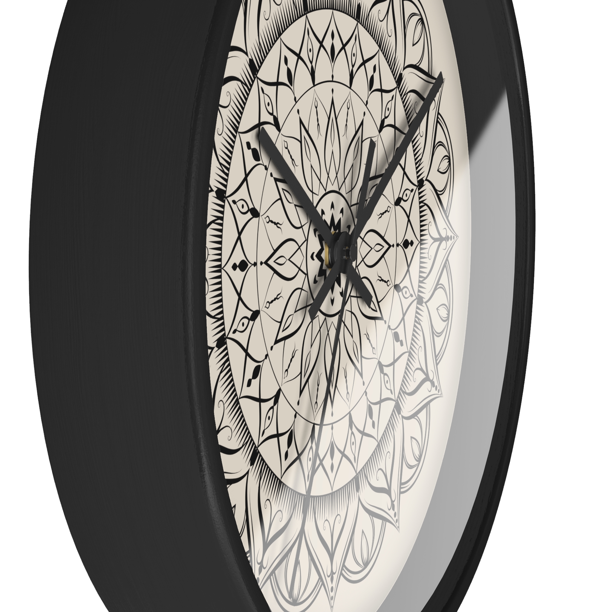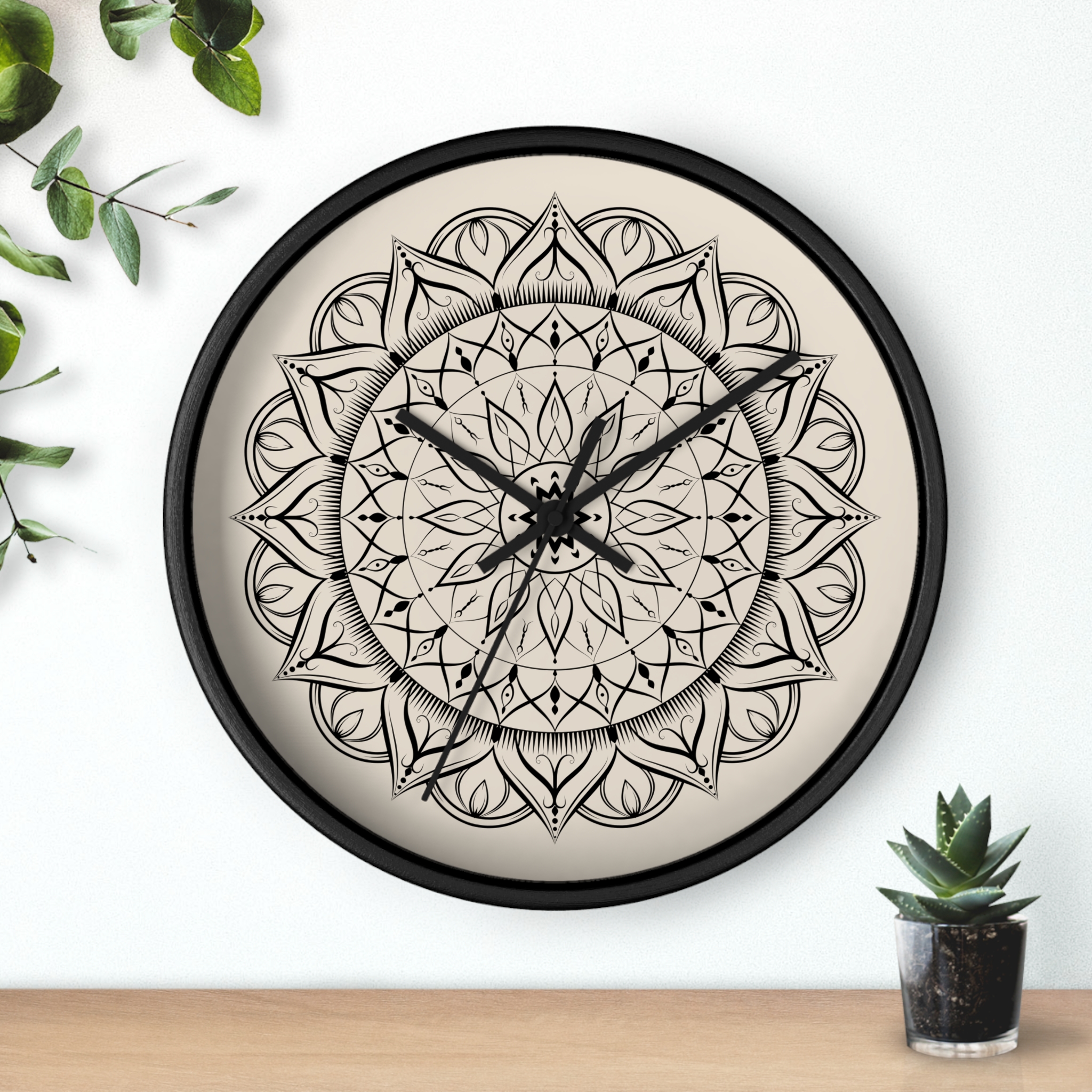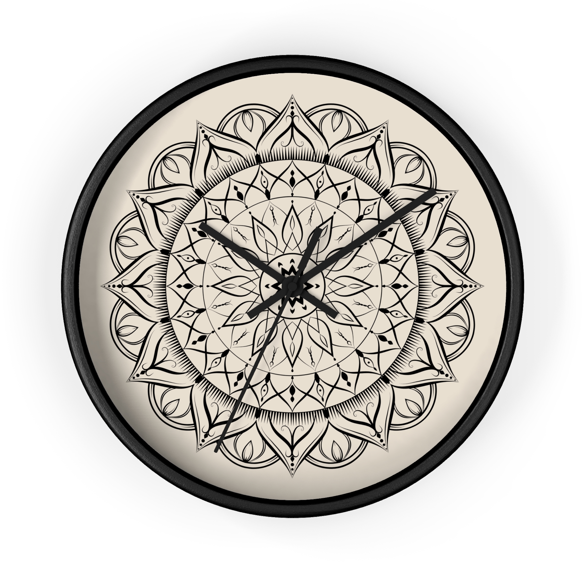 This wall clock brings a calm, meditative center to any room. The hand-drawn mandala sits on a warm, parchment-like background, its intricate black lines pulling the eye inward. It feels like a quiet studio corner or a sunlit reading nook — the kind of piece that slows the pace of the day and invites a minute of breath. Lightweight wood framing and a whisper-quiet mechanism mean the clock reads like a gentle companion rather than a loud appliance. Hang it in a yoga space, above a low console, or in a cozy home office to add subtle artistry without overwhelming the room.