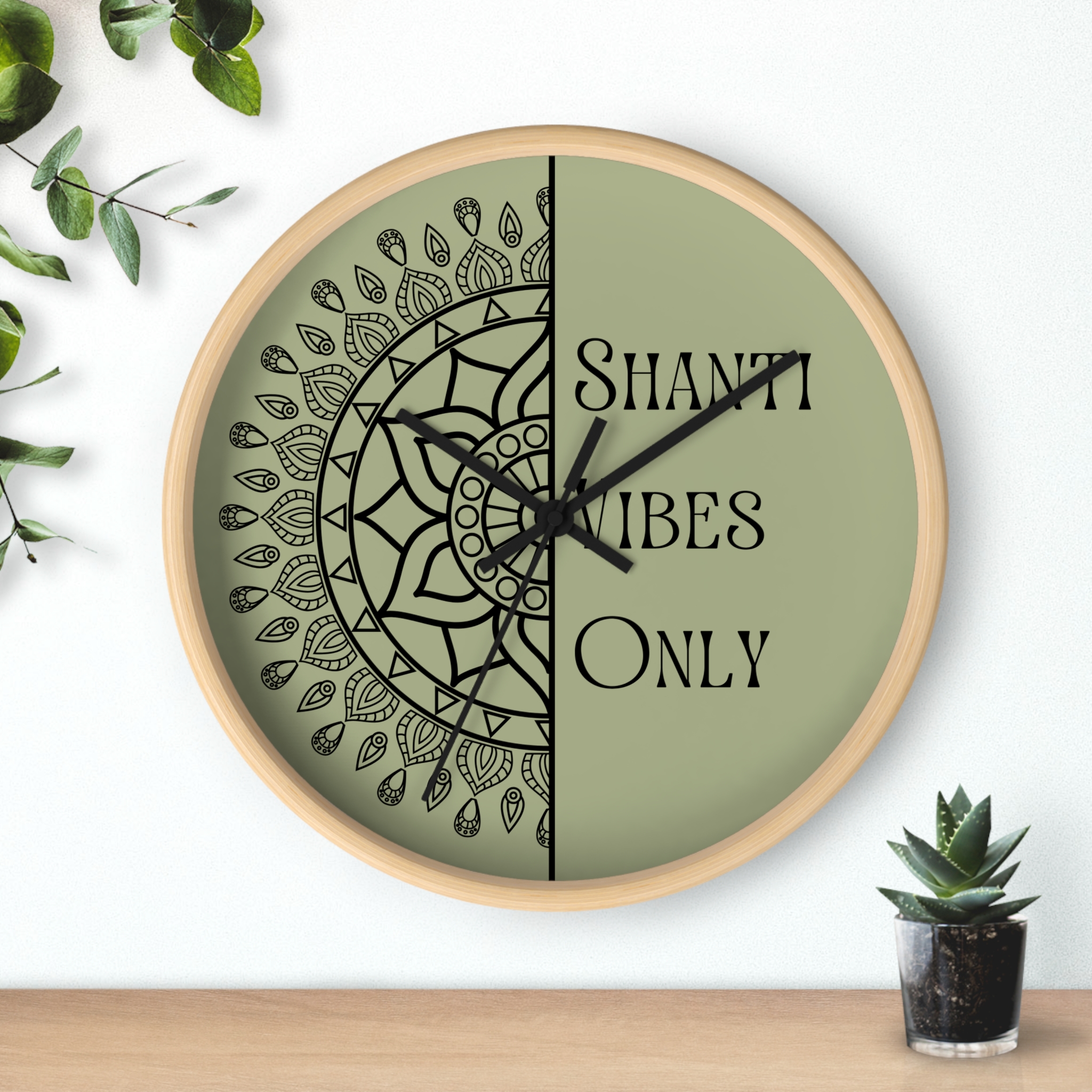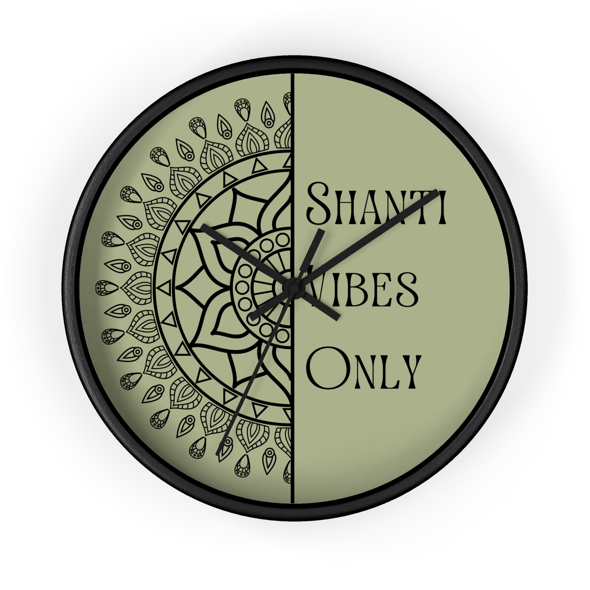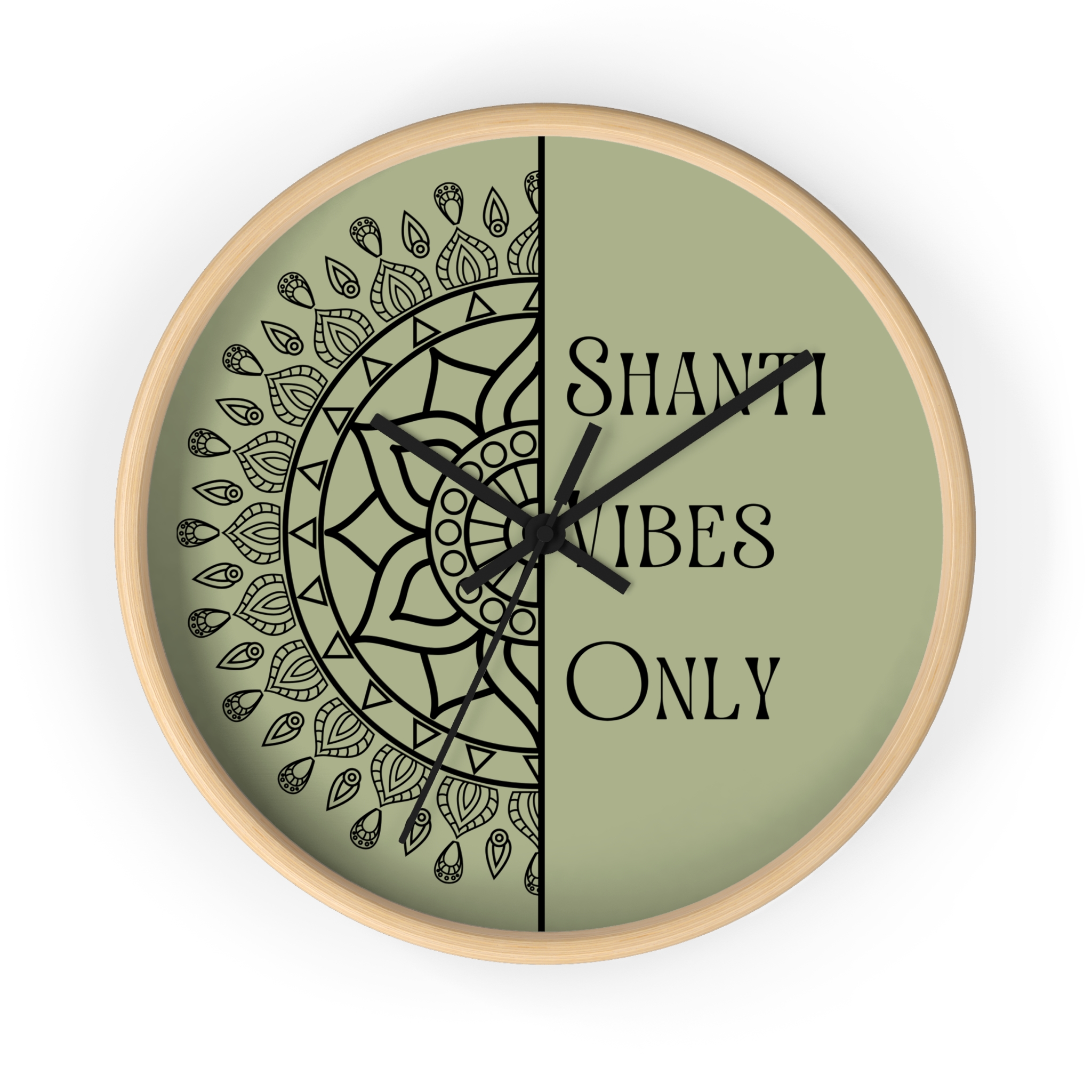 A calm, meditative wall clock that brings a quiet, grounding presence to any room. One half features a hand-drawn mandala while the other carries the text “Shanti Vibes Only” in an elegant, slightly vintage type. The muted sage background and clean black lines give it a minimalist, bohemian look that sits well in yoga corners, meditation spaces, or relaxed living rooms. Lightweight wood frame and plexiglass face keep the design feeling airy while the silent mechanism ensures ticking won’t break the stillness. Hang it above a cushion, near a plant, or on a gallery wall to add a subtle reminder to breathe and slow down.