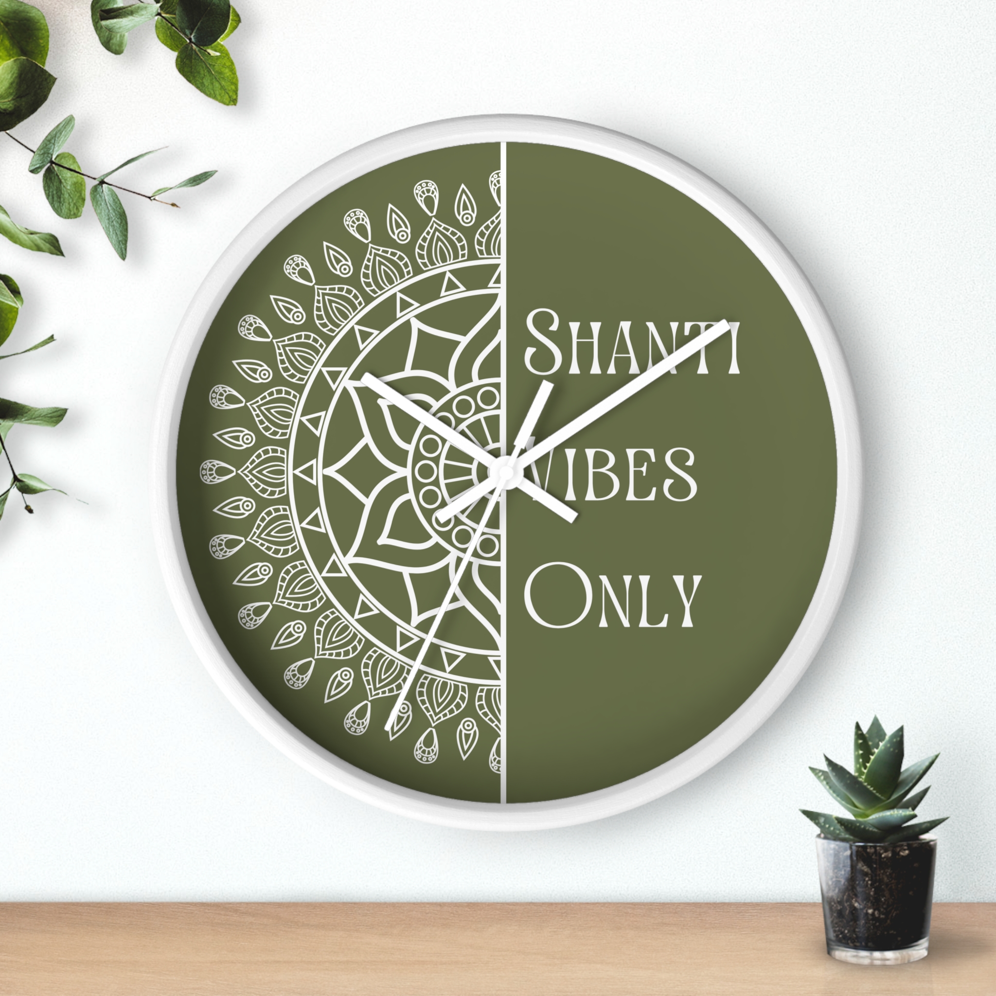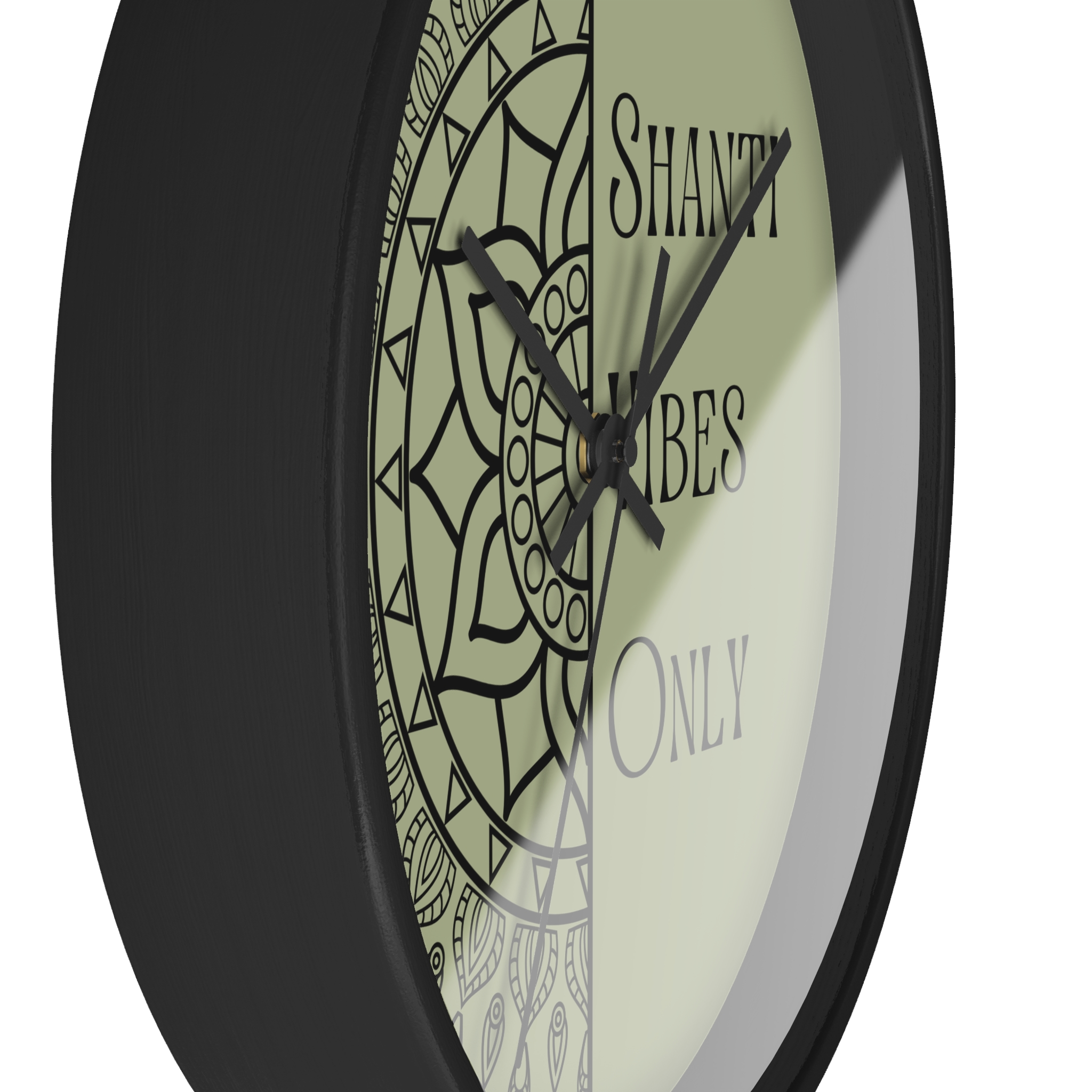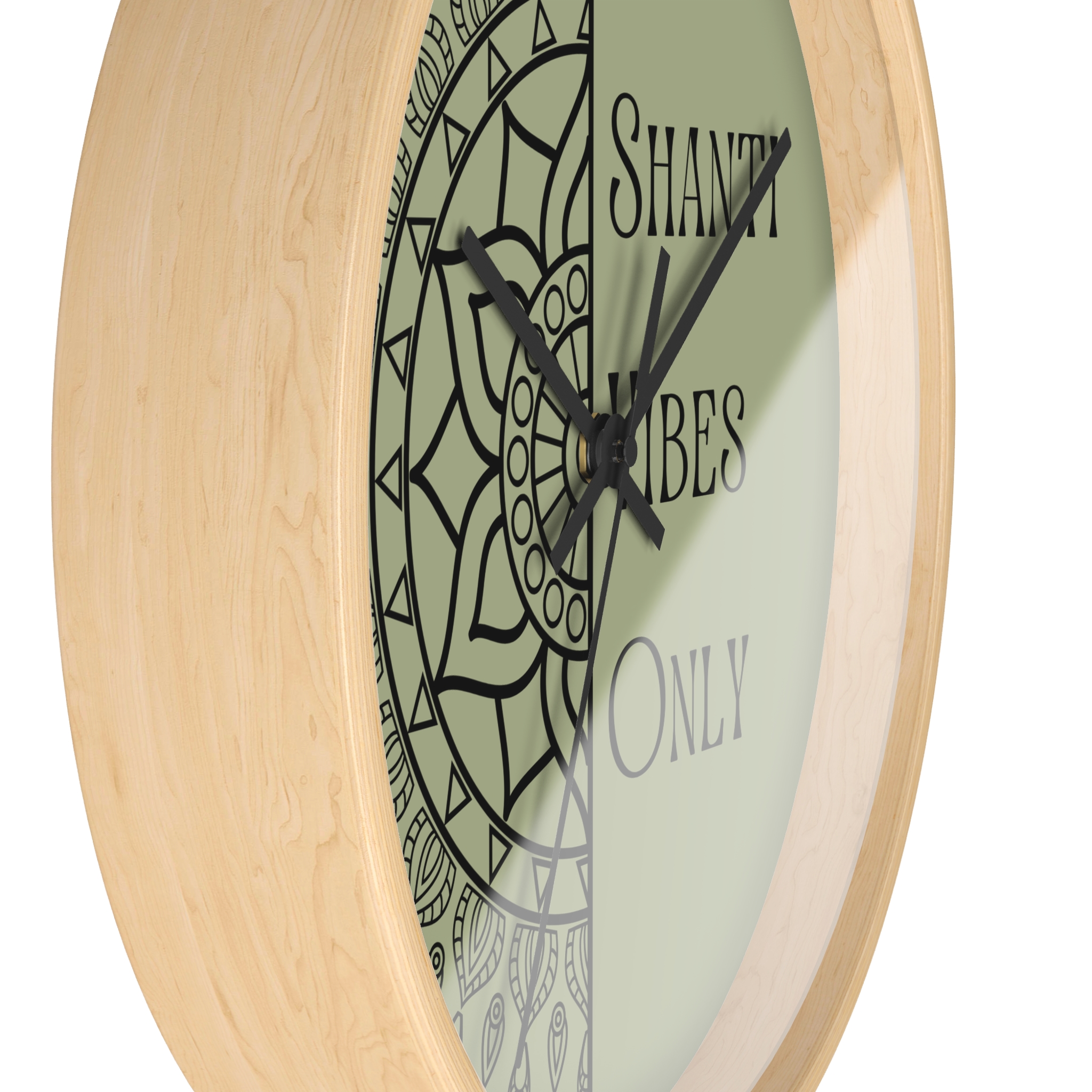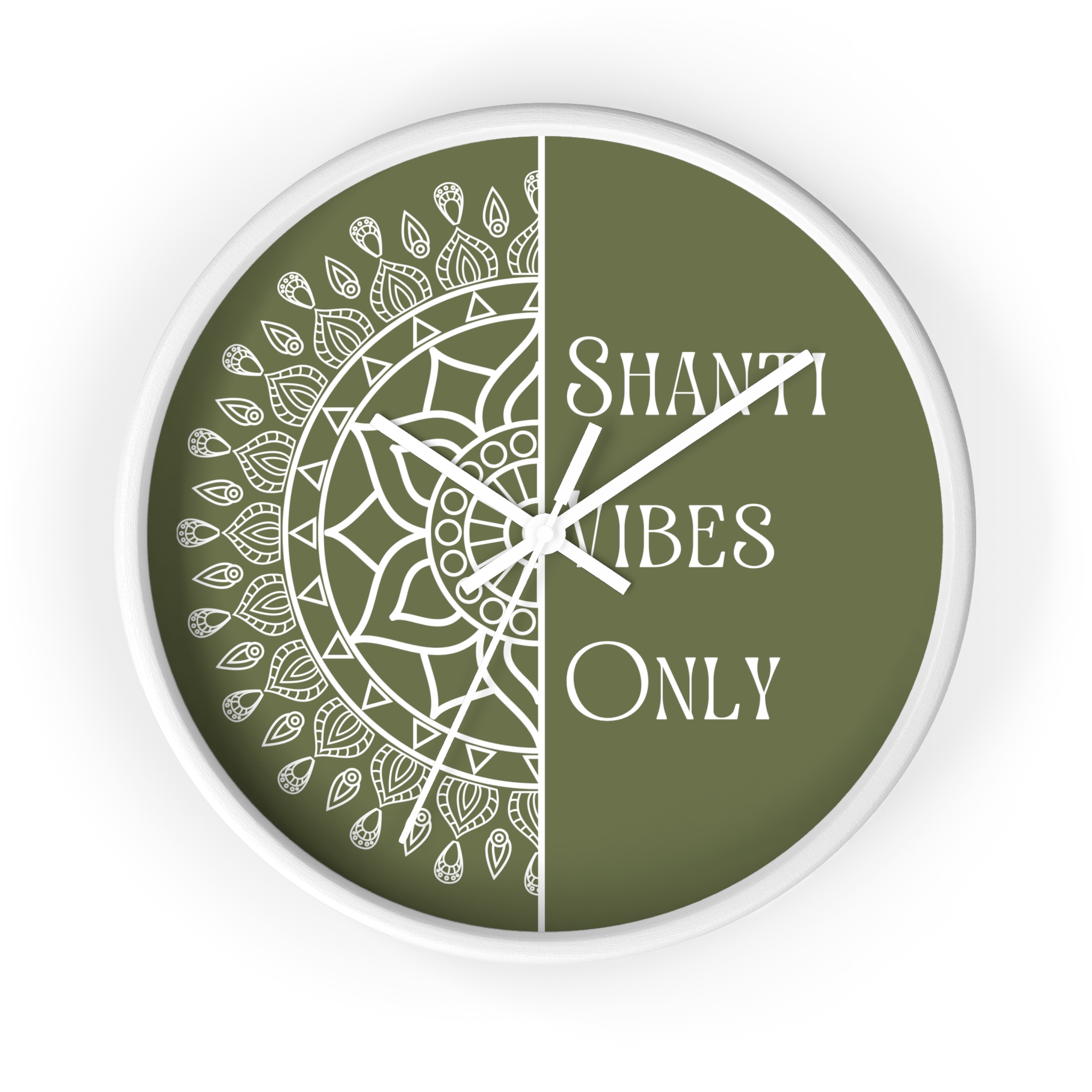 A calm, meditative wall clock that brings a quiet, grounding presence to any room. One half features a hand-drawn mandala while the other carries the text “Shanti Vibes Only” in an elegant, slightly vintage type. The muted sage background and clean black lines give it a minimalist, bohemian look that sits well in yoga corners, meditation spaces, or relaxed living rooms. Lightweight wood frame and plexiglass face keep the design feeling airy while the silent mechanism ensures ticking won’t break the stillness. Hang it above a cushion, near a plant, or on a gallery wall to add a subtle reminder to breathe and slow down.