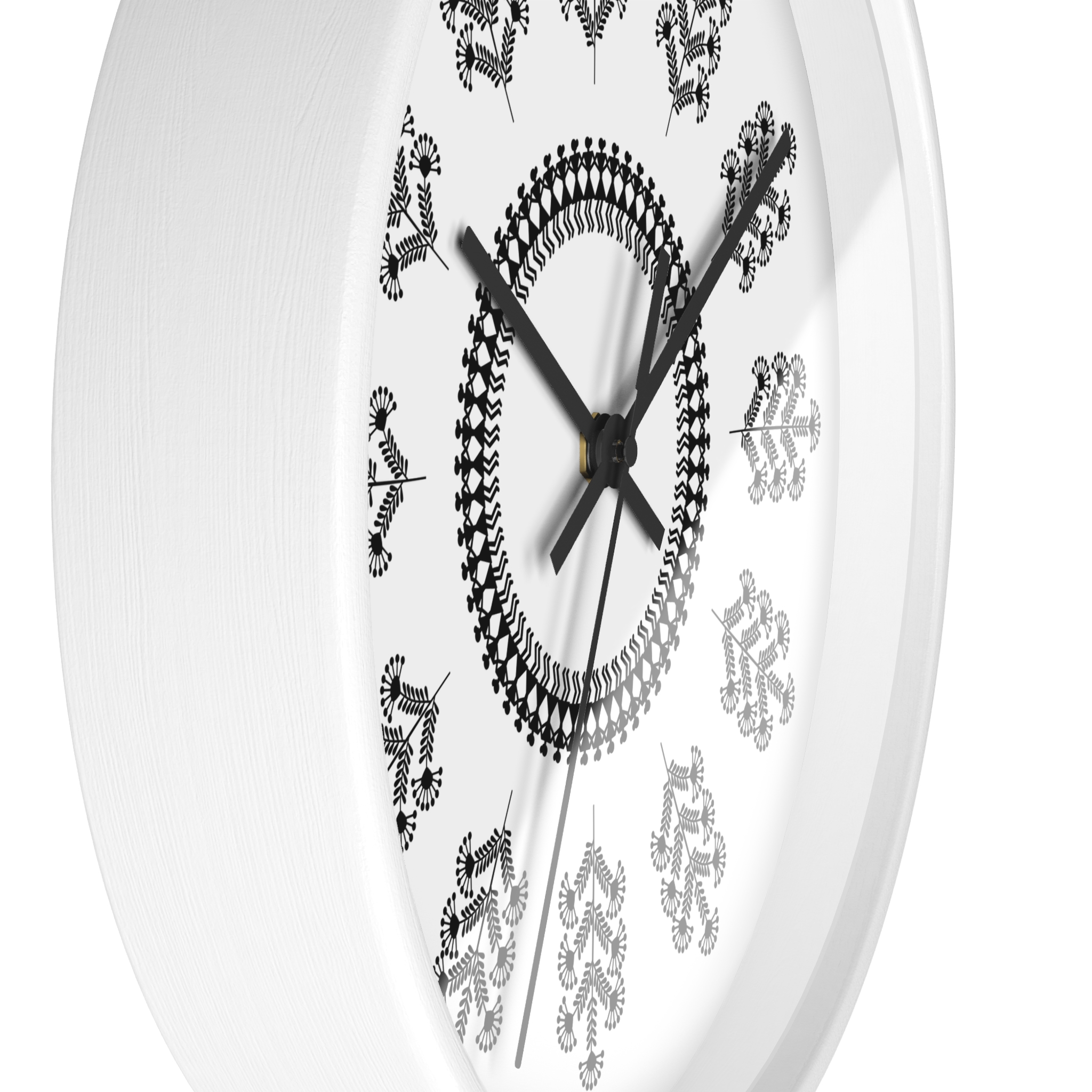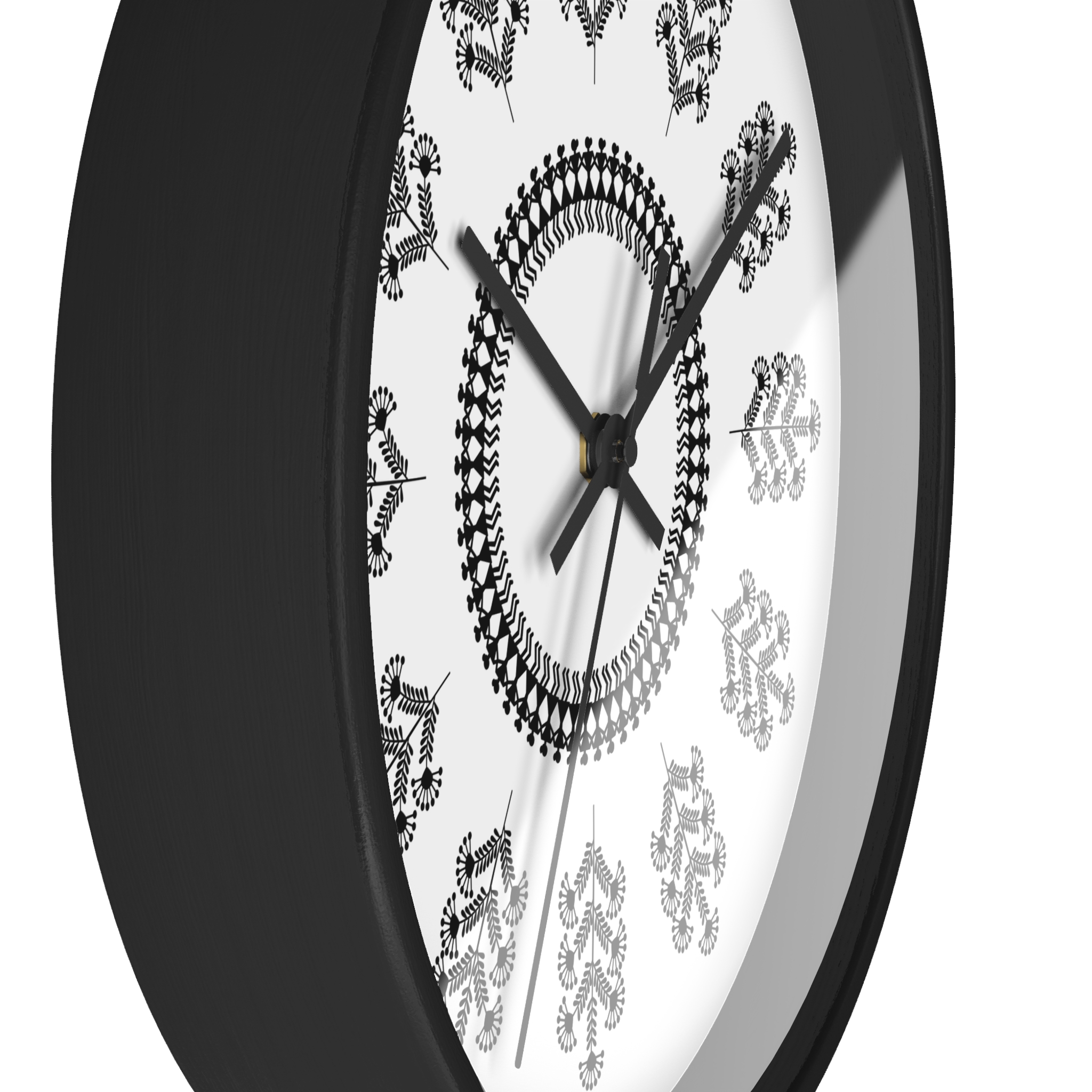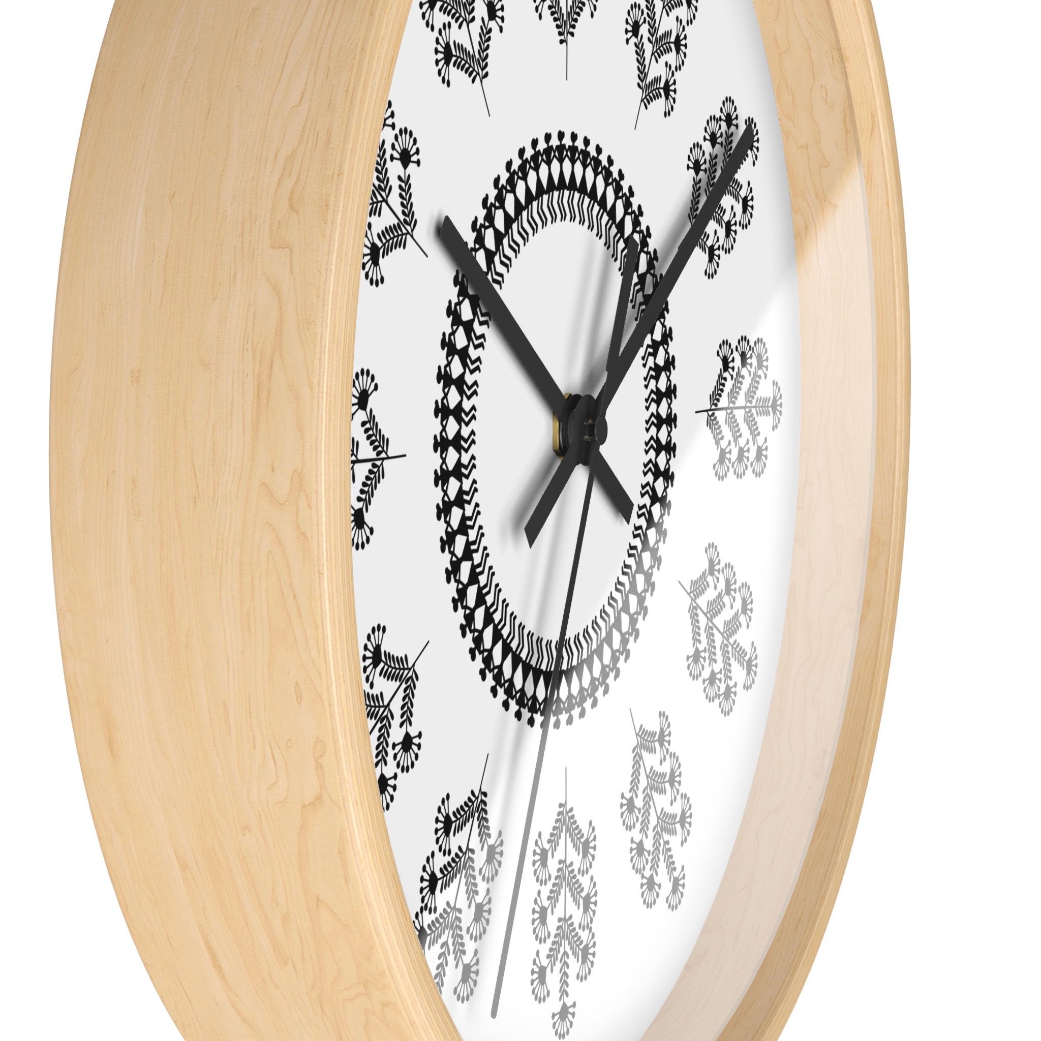 This wooden wall clock brings the calm, rhythmic beauty of Warli folk art into your living space. The black-and-white floral pattern feels handcrafted—each petal and vine arranged like a small story that moves with the passing hours. Its low-contrast palette blends with minimalist, bohemian, or rustic interiors, while the silent mechanism keeps the room peaceful. Hang it on a gallery wall, above a reading nook, or in a cozy kitchen to add subtle cultural texture and quiet movement to everyday moments.