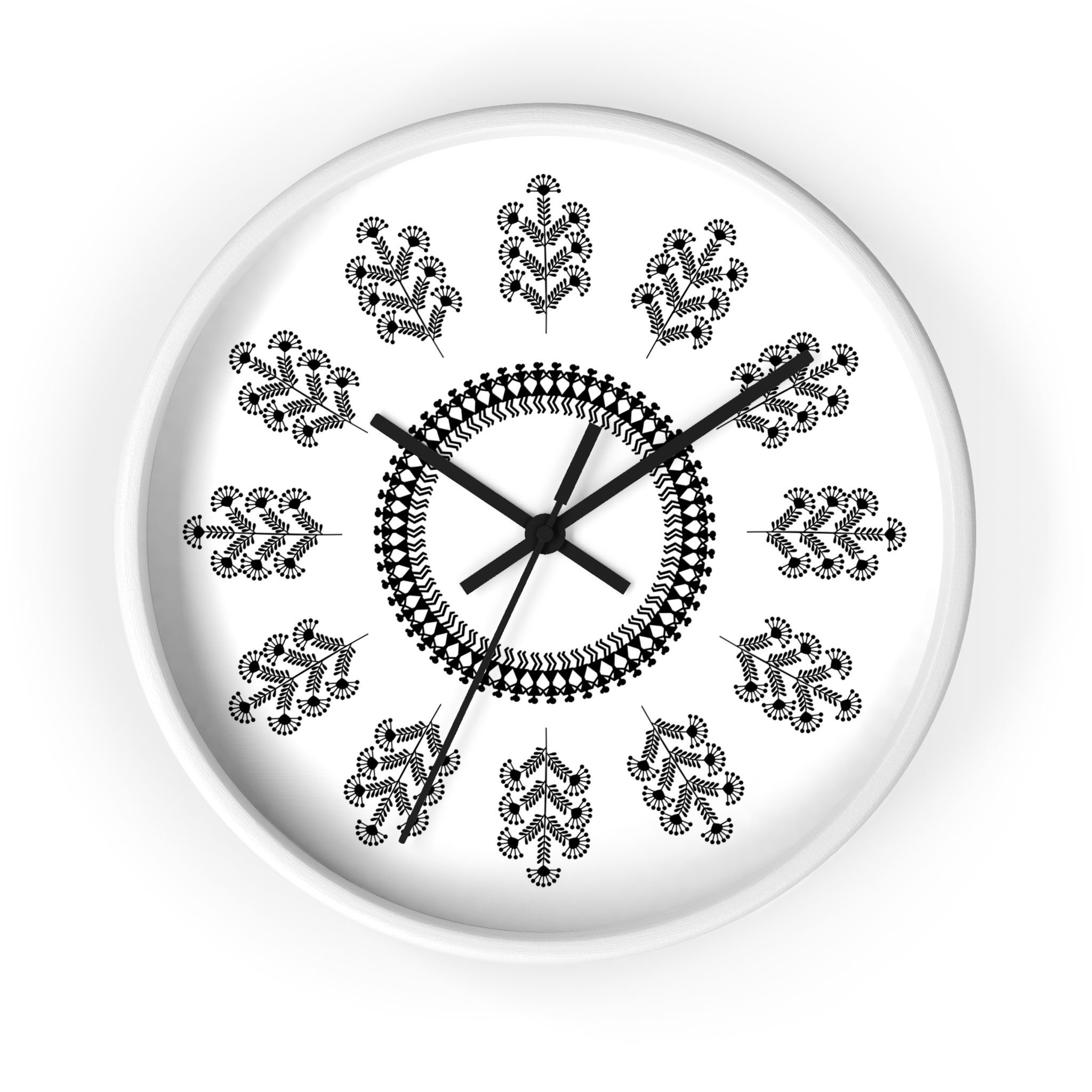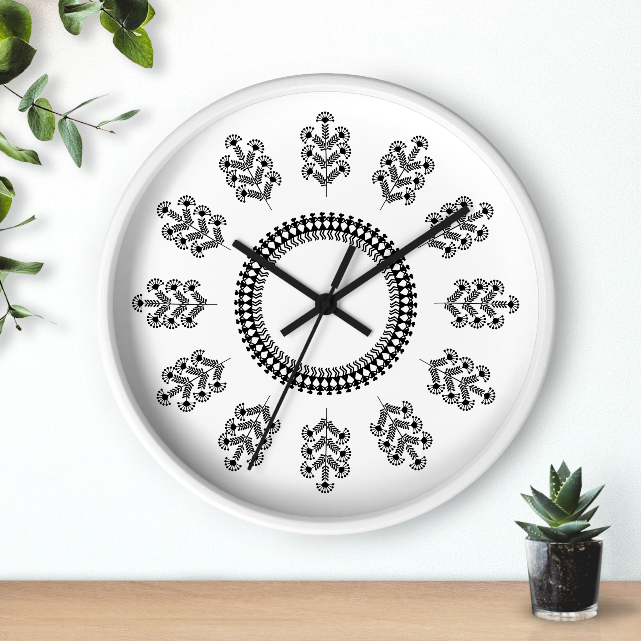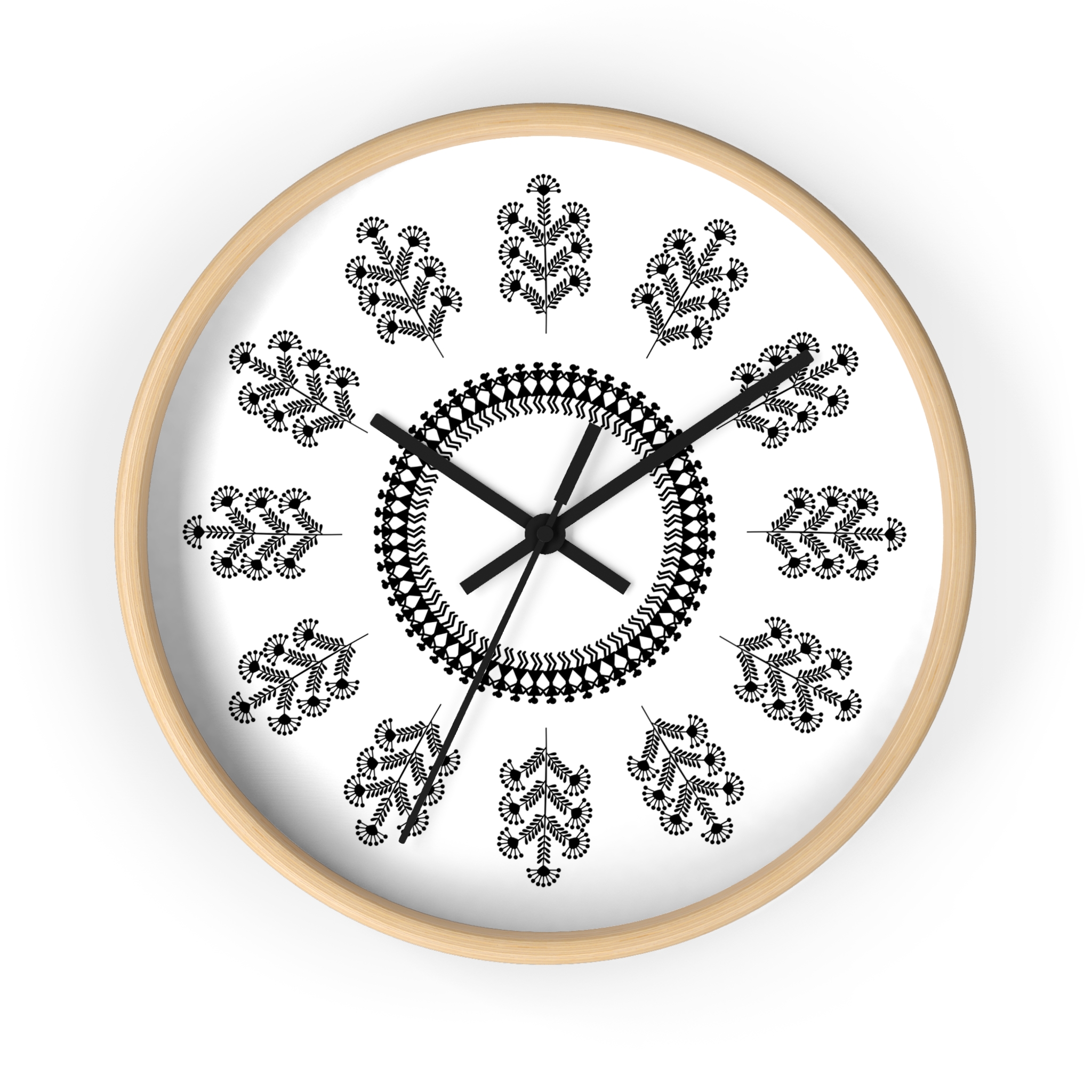 This wooden wall clock brings the calm, rhythmic beauty of Warli folk art into your living space. The black-and-white floral pattern feels handcrafted—each petal and vine arranged like a small story that moves with the passing hours. Its low-contrast palette blends with minimalist, bohemian, or rustic interiors, while the silent mechanism keeps the room peaceful. Hang it on a gallery wall, above a reading nook, or in a cozy kitchen to add subtle cultural texture and quiet movement to everyday moments.